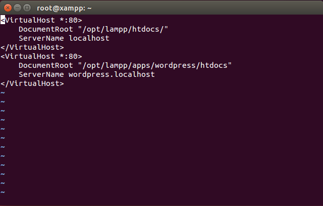 <VirtualHost *:80> DocumentRoot "/opt/lampp/htdocs/" ServerName localhost </VirtualHost> <VirtualHost *:80> DocumentRoot "/opt/lampp/apps/wordpress/htdocs" ServerName wordpress.localhost </VirtualHost>This contains two virtual host configuration blocks: